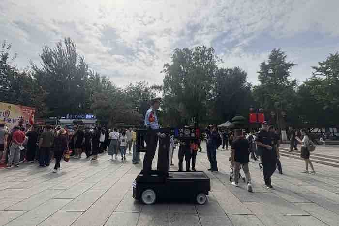 秋日的大明湖,水光潋滟,超然楼前广场上游人如织。 智能机器人“历小警”熟练地指挥疏散往来人流,时不时与现场群众亲切互动,发出安全提醒,成为景区一道亮丽的风景线。