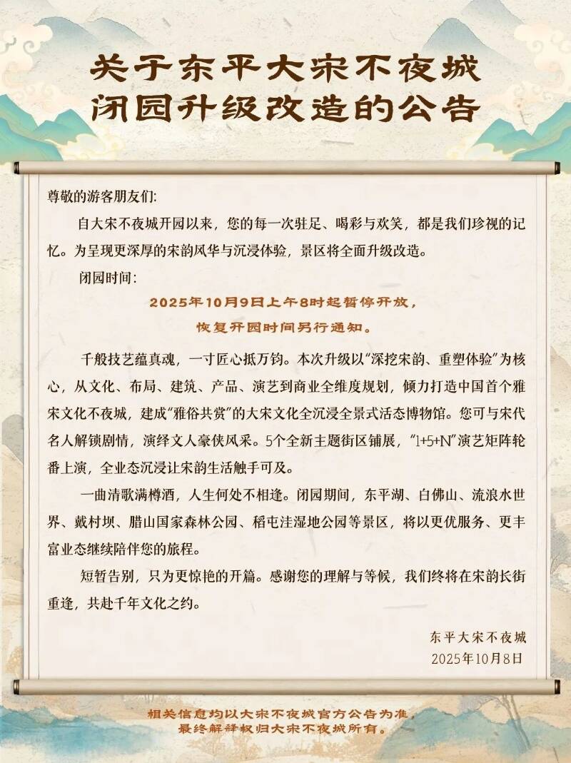 >>>注意别跑空!东平大宋不夜城10月9日起闭园升级改造 恢复开园时间另行通知