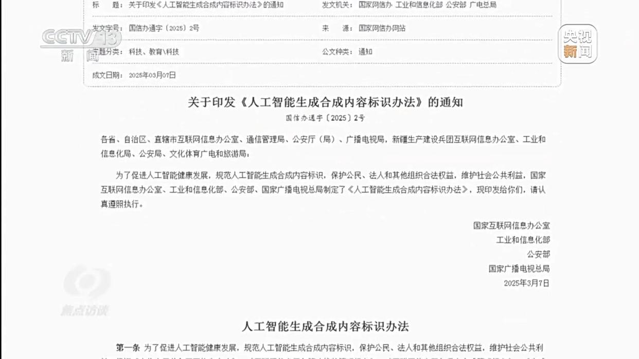 今年9月1日,国家网信办等四部门联合发布的《人工智能生成合成内容标识办法》正式施行,该办法明确所有AI生成的文字、图片、视频等内容都要“亮明身份”,需要添加显式标识和隐式标识。