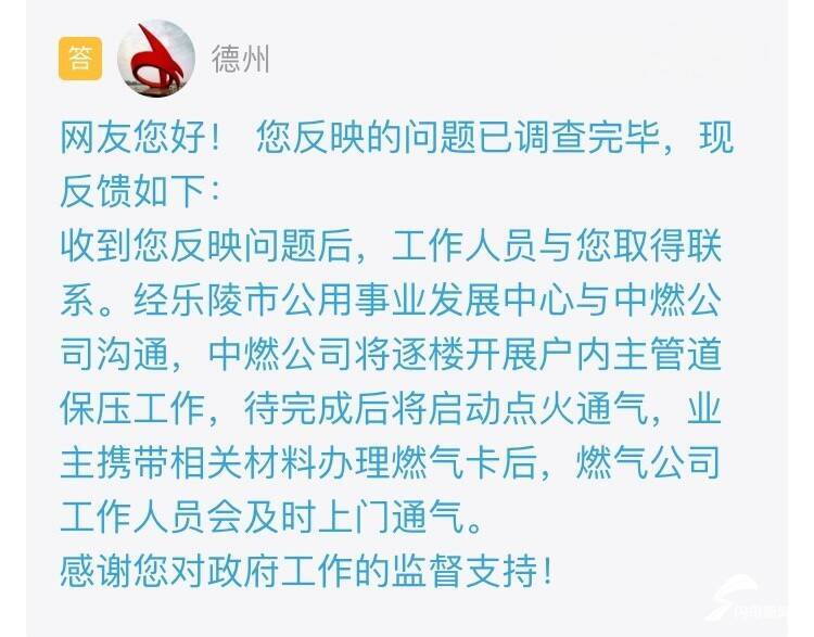 收到留言后,德州市进行了办理并回复:经乐陵市公用事业发展中心与中燃公司沟通,中燃公司将逐楼开展户内主管道保压工作。待完成后将启动点火通气,业主携带相关材料办理燃气卡后,燃气公司工作人员会及时上门通气。