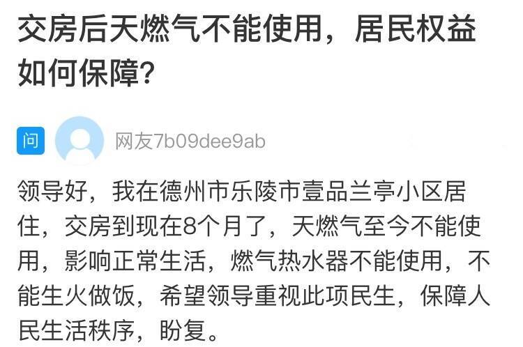 齐鲁网·闪电新闻10月15日讯 一位德州网友在闪电新闻网络问政平台留言:自己在乐陵市壹品兰亭小区居住。交房到现在8个月了,天然气至今不能使用,影响正常生活。希望有关部门协调解决。