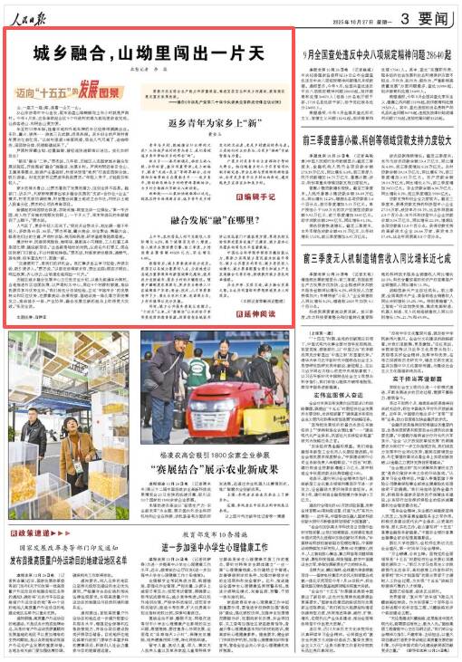 齐鲁网·闪电新闻10月27日讯 今天出版的《人民日报》在第3版刊文《城乡融合,山坳里闯出一片天》,文中称,从山东济南市中心出发,驱车沿盘山路蜿蜒向上半小时就是芦南村。今年4月底,这条串联起山区9个行政村的港九路拓宽改造完成,让游客进山、村民出山更方便。芦南村深藏山坳、位置偏僻,曾经连快递都难以送达,如今,乐队、篝火、烧烤……游客三五成群,很是热闹。