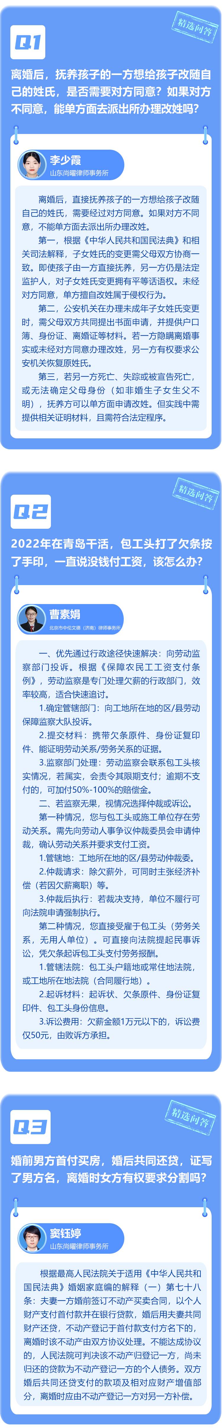 离婚后,直接抚养孩子的一方想给孩子改随自己的姓氏,是否需要经过对方同意?如果对方不同意,能单方面去派出所办理改姓吗?婚前男方首付买房,婚后双方共同还贷,房产证只写了男方的名字,离婚时这套房子的增值部分,女方有权要求分割吗?工地拖欠工资怎么办?一起来看“闪电律师团”本周精选问答!