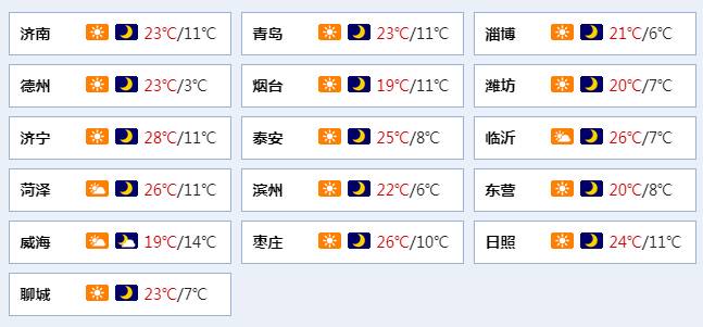 >>>26日白天到夜间,全省天气晴到少云;26日早晨前后鲁西北和半岛地区局部有雾或轻雾。滨州、东营和潍坊北风5~6级阵风7~8级转南风3~4级,烟台和威海北风5~6级阵风7~8级减弱到3~4级,其他地区北风4级阵风5~6级转南风3~4级。夜间最低气温:鲁西北、鲁中山区和半岛内陆地区4℃左右,有霜冻或轻霜冻;菏泽、济宁、枣庄和沿海地区11℃左右,其他地区7℃左右。最高气温:鲁南地区26℃左右,北部沿海地区19℃左右,其他地区22℃左右。