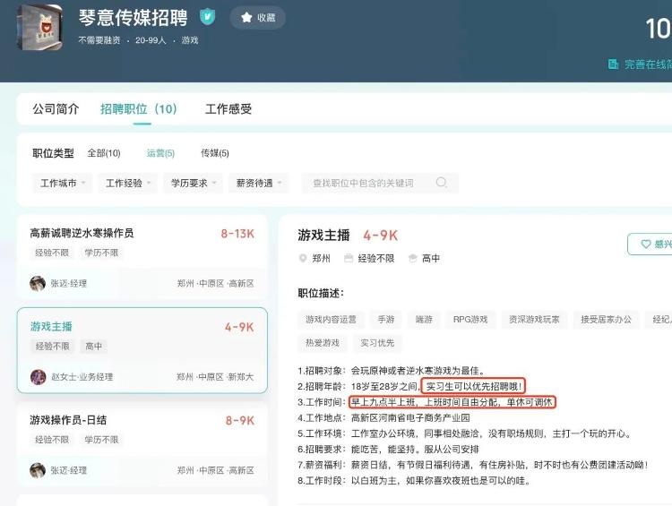 在网上搜索该公司,可以看到不少招聘信息。在BOSS直聘网站上,该公司发布了10条招聘信息,其中招聘“游戏主播”的信息显示,薪资4000-9000元、经验不限,要求会玩原神或者逆水寒游戏为最佳,招聘年龄上还注明“实习生可以优先招聘”。在工作时间上,该公司称“早上九点半上班,上班时间自由分配,以白班为主……”