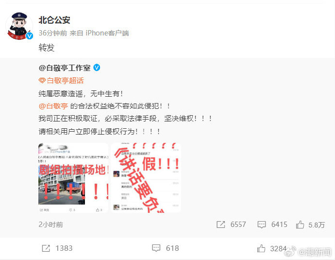 近日有两则小道消息称:演员白敬亭在北仑嫖娼被抓。刚刚,白敬亭工作室官方回应:纯属恶意造谣,无中生有!而浙江宁波市公安局北仑分局官方微博@北仑公安 转发了工作室辟谣新闻。