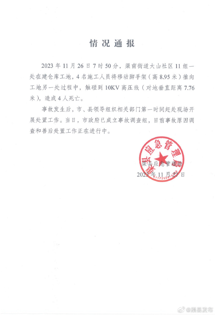 四川渠县通报触电事件:4名工人移动脚手架碰到高压线身亡