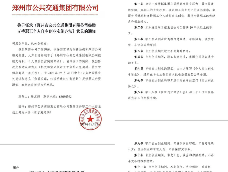 据网友发文截图显示,郑州市公共交通公司(下称郑州公交)12月21日发布了关于征求《郑州市公共交通集团有限公司鼓励支持职工个人自主创业实施办法》意见的通知(下称《通知》)。