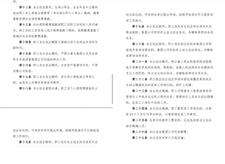该《意见》共27条,其中包含:1.该办法适用于在集团公司工作满10年及以上的职工;2.创业期间离岗,集团公司保留其劳动关系;3.自主创业期限不超过2年;4.创业期间保留原职级,工龄可连续计算,管理人员不再保留其职务;5.期间停发工资、奖金和津贴补助,不再享受各项福利待遇;6.创业期间社会保险等费用由公司承担,住房公积金及企业年金终止或由本人承担缴纳;7.创业期间提前终止协议,可向所在单位提出申请,批准后可提前返回工作岗位等。