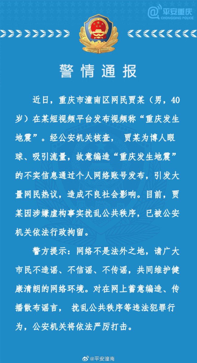 @平安潼南 消息,近日,重庆市潼南区网民贾某(男,40岁)在某短视频平台称“重庆发生地震”。经公安机关核查,贾某为博人眼球、吸引流量,故意编造“重庆发生地震”的不实信息通过个人账号发布,引发大量网民热议,造成不良社会影响。目前,贾某因涉嫌虚构事实扰乱公共秩序,已被公安机关依法行政拘留。
