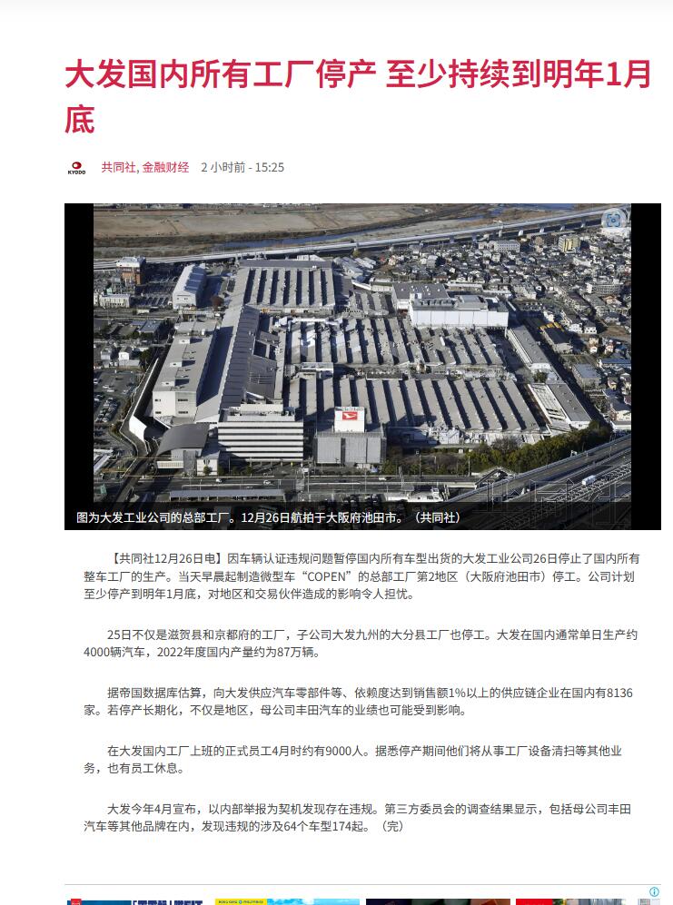 CYQY-生活与科技中新网12月26日电 据日本共同社报道,26日,丰田汽车子公司大发工业公司停止了日本国内所有整车工厂的生产,并计划至少停产到明年1月底。4月时,在大发日本国内工厂上班的正式员工约有9000人。据悉,停产期间,他们将从事工厂设备清扫等其他业务,也有员工休息。大发曾在今年4月宣布,以内部举报为契机,发现存在违规。第三方委员会的调查结果显示,包括大发母公司丰田汽车等其他品牌在内,发现了174项违规,涉及64款车型。(中新财经)