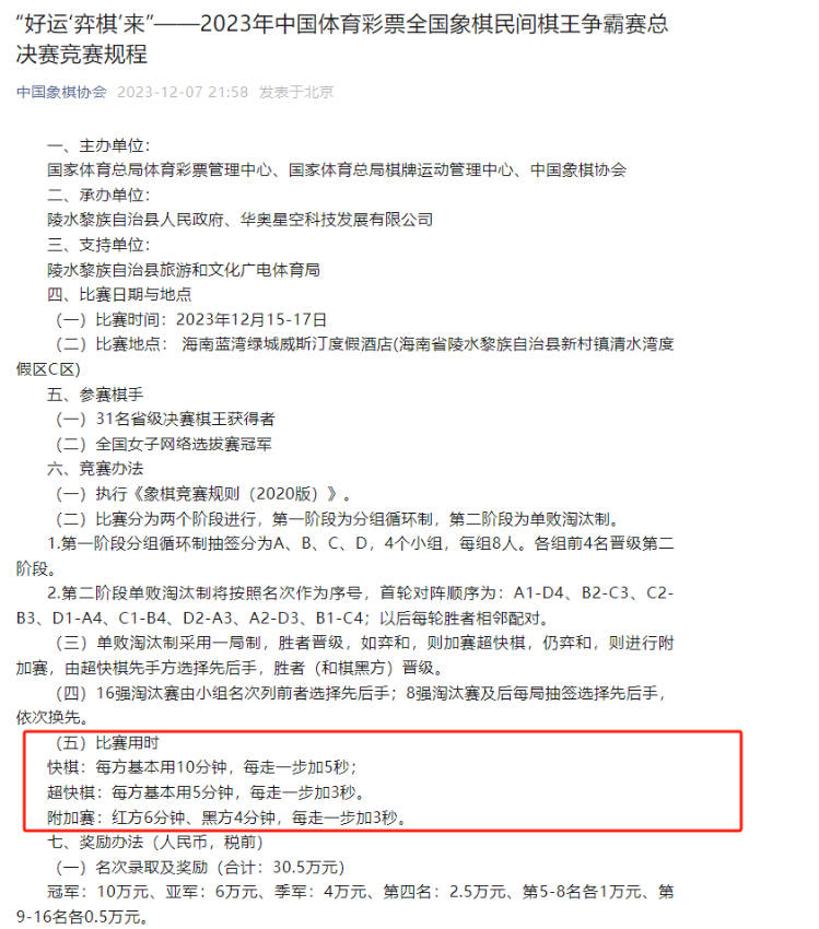 2023年中国体育彩票全国象棋民间棋王争霸赛总决赛在海南陵水一度假酒店进行。据比赛规程中的日程安排,12月17日13:30举行半决赛,15:00举行决赛。总决赛结束后,于18:00举行棋王挑战赛。此外“经费”项提到,参赛人员食宿须接受大会统一安排,按组委会规定的路线和时间抵离赛区。27日,颜某某告诉潇湘晨报记者,决赛大概于17日下午三四时许就已结束。这场决赛用时大概十分钟左右,下的是“快棋”。