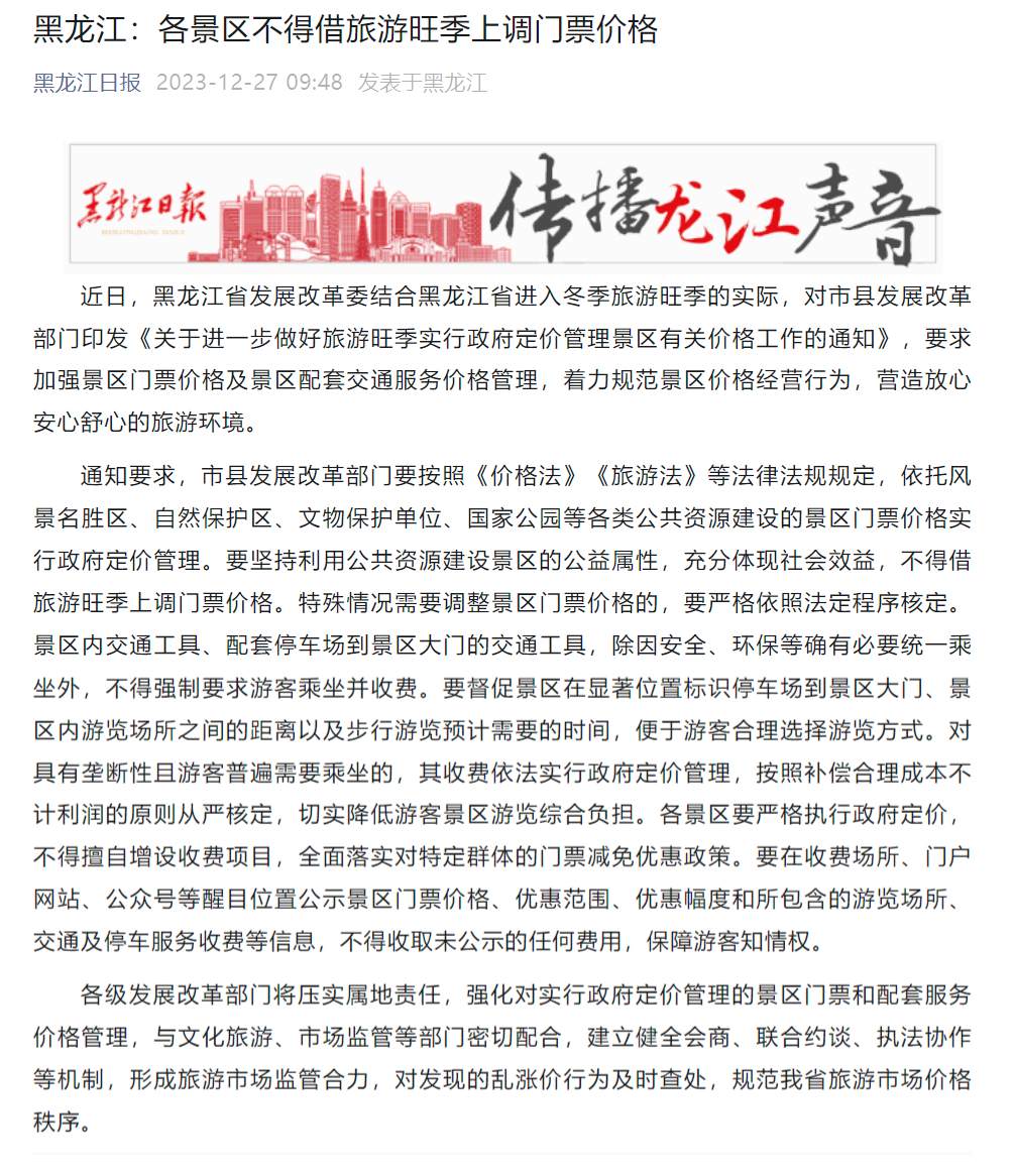 近日,黑龙江省发展改革委结合黑龙江省进入冬季旅游旺季的实际,对市县发展改革部门印发《关于进一步做好旅游旺季实行政府定价管理景区有关价格工作的通知》,要求加强景区门票价格及景区配套交通服务价格管理,着力规范景区价格经营行为,营造放心安心舒心的旅游环境。