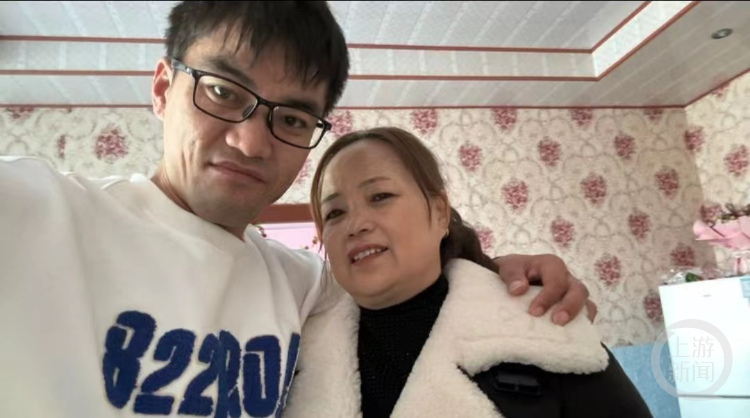 北京外卖小哥李强(郁豹豹)和妈妈的合影。受访者供图