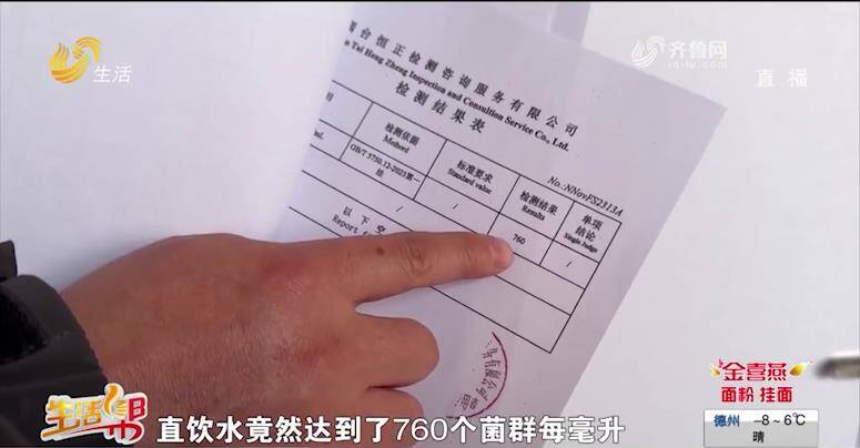 在第三方检测机构出具的报告中记者看到,有自来水、净化水和直饮水三个报告。自来水的报告显示,菌落总数是85个菌群每毫升;净化水报告显示,菌落总数达到了670个菌群每毫升;直饮水报告显示,菌落总数达到了760个菌群每毫升。这个数据让栾先生无法接受。