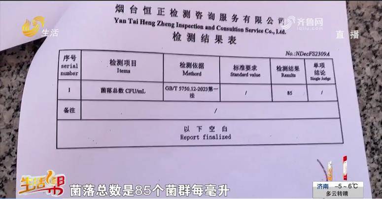 栾先生说:“我们公司正好有做水质化验的部门,我就请公司的同事到家里测了一下水质。不看不知道,一看吓一跳,菌落总数可能就达到了六七百个菌群每毫升。”