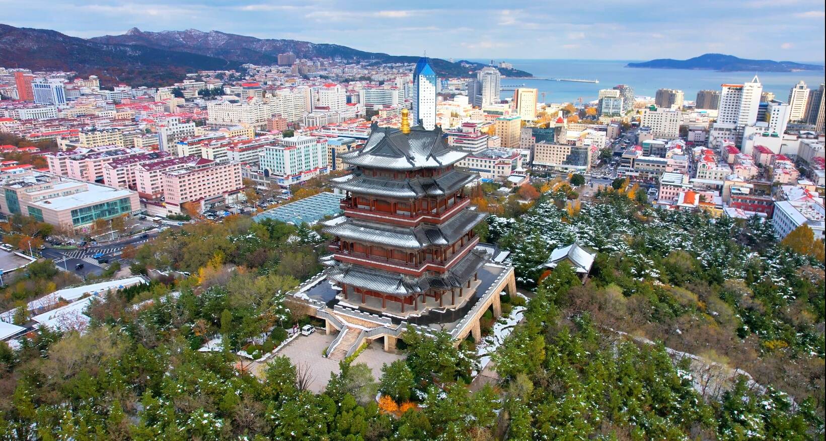 有着500多年历史的环翠楼,西负苍山,东瞰碧海。站在环翠楼顶端眺望威海全局,一片雪中美景尽收眼底,可谓“欲穷千里目”。