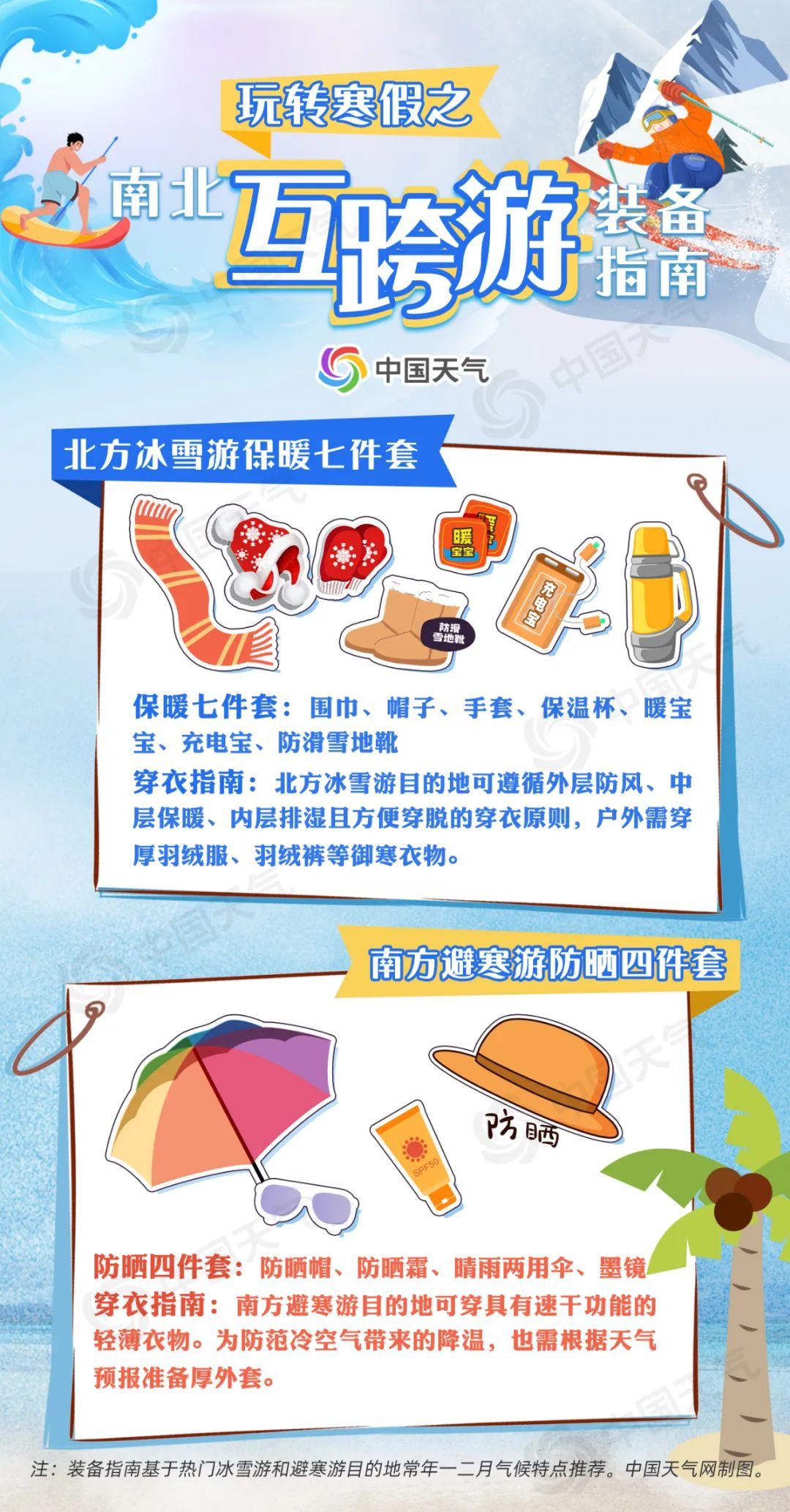 无论是北上戏冰雪,还是南下避寒游,装备是否齐全直接关系到旅游行程的质量。对于前往北方冰雪游的朋友来说,防寒保暖至关重要;南下避寒则要注意防晒防蚊。
