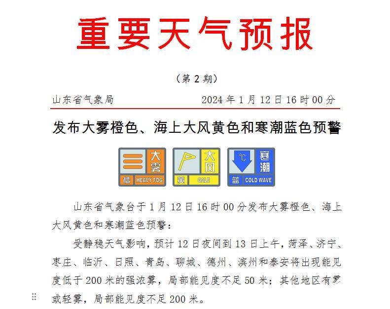 齐鲁网·闪电新闻1月12日讯 山东省气象台于1月12日16时00分发布大雾橙色、海上大风黄色和寒潮蓝色预警: