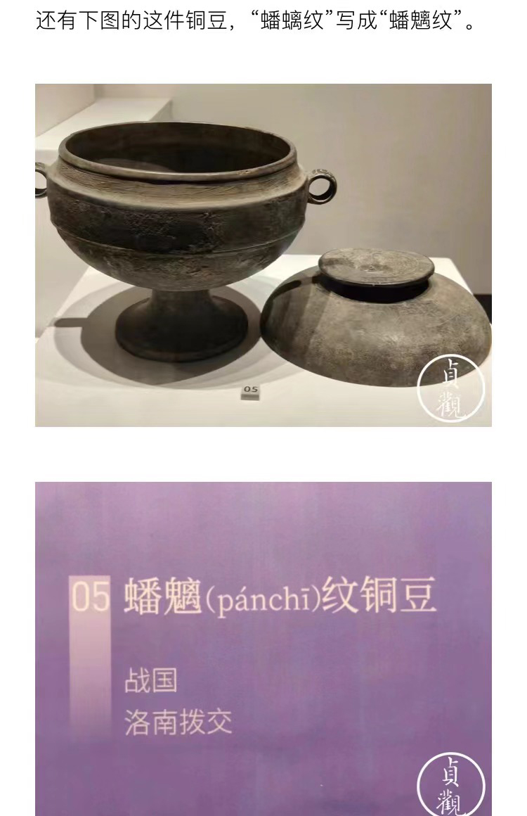 文章称,秦汉馆中很多展品不仅没有英文标识,甚至连展品的基本信息都不全,有的文物名称也被标错,如:“鹰兽相搏纹饰铜牌饰” 被误写为“铜鹰兽权博牌饰”;介绍一件铜豆的展品信息中,“蟠螭纹”误写成“蟠魑纹”。