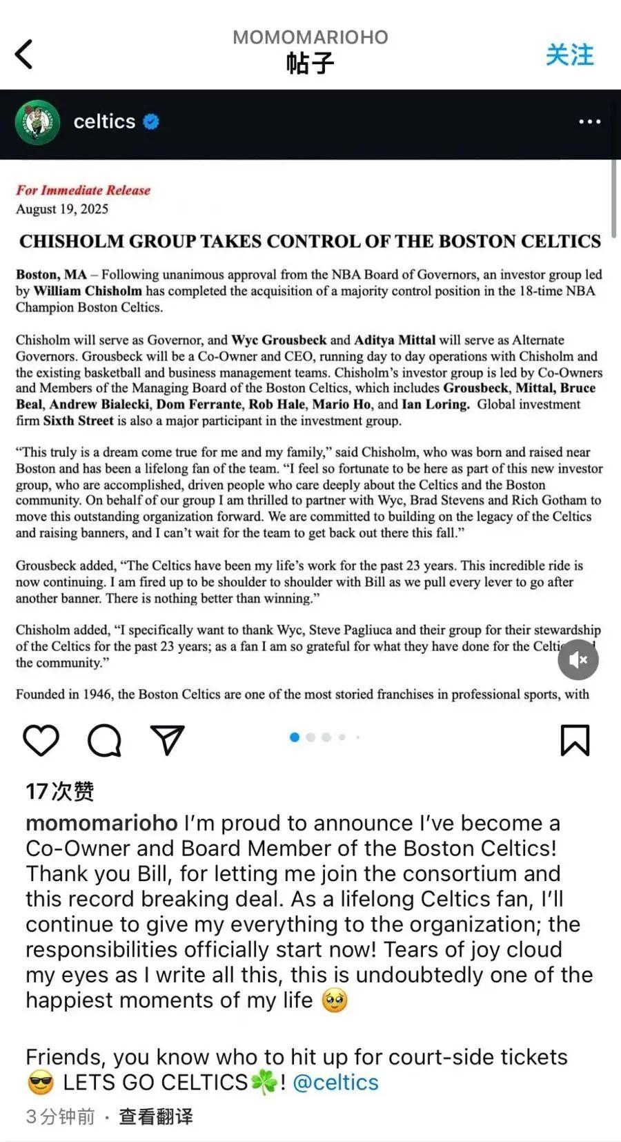 今天,何猷君成功完成竞标,成为NBA历史上夺冠最多的球队——波士顿凯尔特人的CO-OWNER(共同所有人)。此消息一经公布,立即在海内外体育界和广大球迷群体中引发热议。