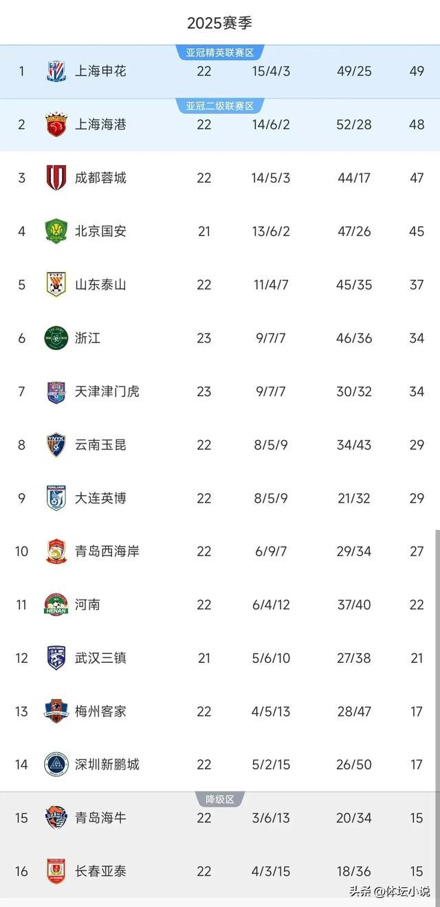 北京时间8月24日,中超联赛第22轮的比赛继续进行,在刚刚结束了几场对决,其中卫冕冠军上海海港1-1爆冷与天津握手言和,河南火力全开4-0横扫大连,山东泰山3-2险胜青岛西海岸,这样一来最新的积分榜更新了,上海双雄排名前二,成都第三,北京国安第四,山东泰山第五!