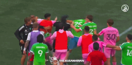 西雅图海湾人的25号球员杰克逊-拉根,在冲突中非常抢眼,也遭到迈阿密国际球员的凶狠报复。双方球员在场上直接抱摔、拳击!