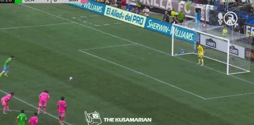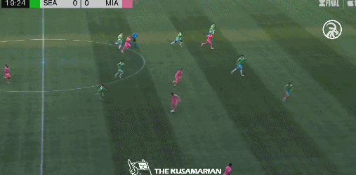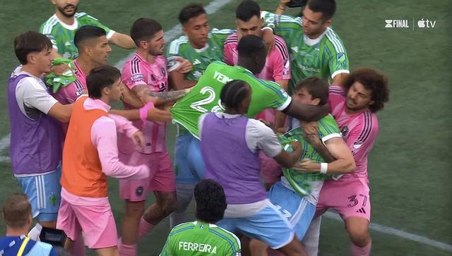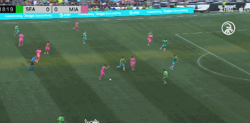 顶住迈阿密国际的开场三板斧之后,西雅图海湾人组织起有效攻势。第26分钟,迈阿密国际丢球了: