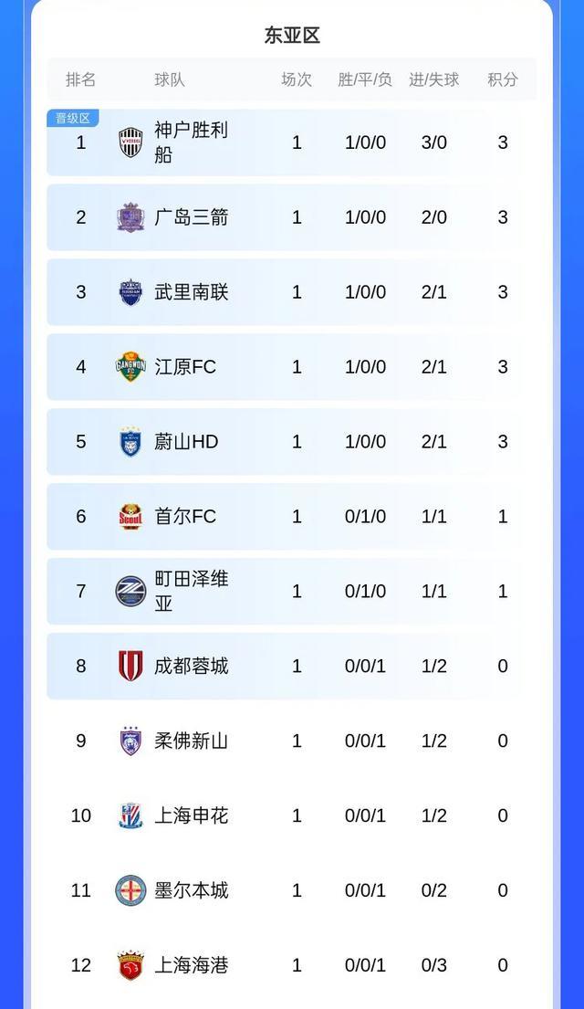 北京时间9月17日亚冠精英联赛继续火热进行,昨天东亚区率先进行了4场比赛,其中广岛三箭客场2-0战胜墨尔本城登上了积分榜榜首,首尔FC客场1-1战平町田泽维亚,武里南联2-1战胜柔佛新山,上海申花客场1-2遭到江源的逆转。今天剩余的两场比赛全部都有中超球队出战,其中成都蓉城客场挑战韩国k联赛冠军蔚山HD,上海海港主场迎战日本强敌神户胜利船。最终全场比赛结束,成都蓉城客场1-2遭到蔚山HD绝杀,上海海港主场0-3输给神户胜利船。第一轮比赛全部结束,积分榜也正式出炉: