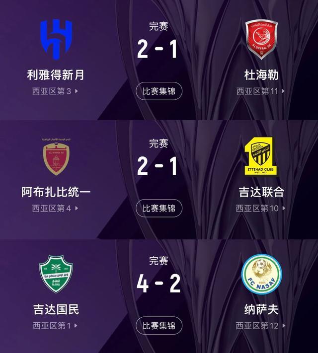 昨天东亚区进行了4场比赛,而西亚区的6场比赛已经全部结束,其中利雅得新月2-1主场战胜杜海勒,吉达联合客场1-2遭到阿布扎比统一的绝杀,卫冕冠军吉达国民主场4-2战胜纳萨夫。今天仅剩的两场比赛,都有中超球队出战,这也是中国球迷们比较关心的。