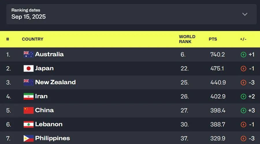 以及来自亚大区的球队:大洋洲的澳大利亚(6)、新西兰(25),以及亚洲的5支队伍日本(22)、伊朗(26)、中国(27)、黎巴嫩(30)、菲律宾(37)。