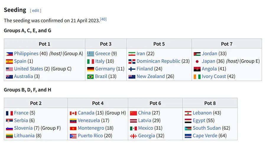 2019年世界杯,中国男篮作为东道主被直接列为种子球队,这是特例我们按下不提。以2023年世界杯为例,中国队在晋级当届世界杯正赛时,世界排名第27位,在所有晋级的32支球队中则排名第20位,算上被纳入种子队行列的第一主办国菲律宾,中国队在分档时排名第21位——每档4支球队,中国队和拉脱维亚、墨西哥、格鲁吉亚等球队一起,被纳入了第六档。