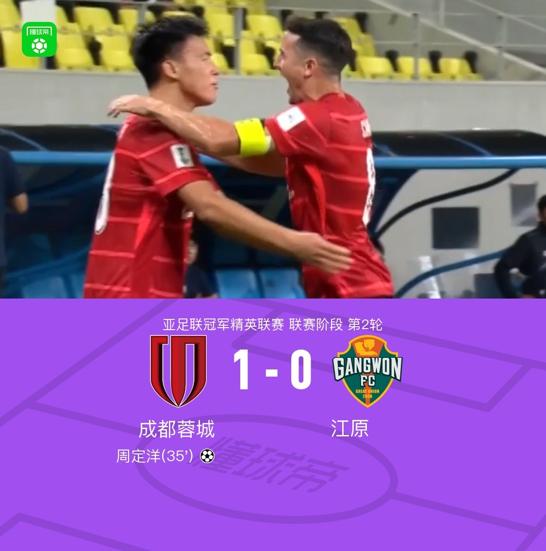 第35分钟,第35分钟,周定洋凌空抽射破门!蓉城1-0领先江原!