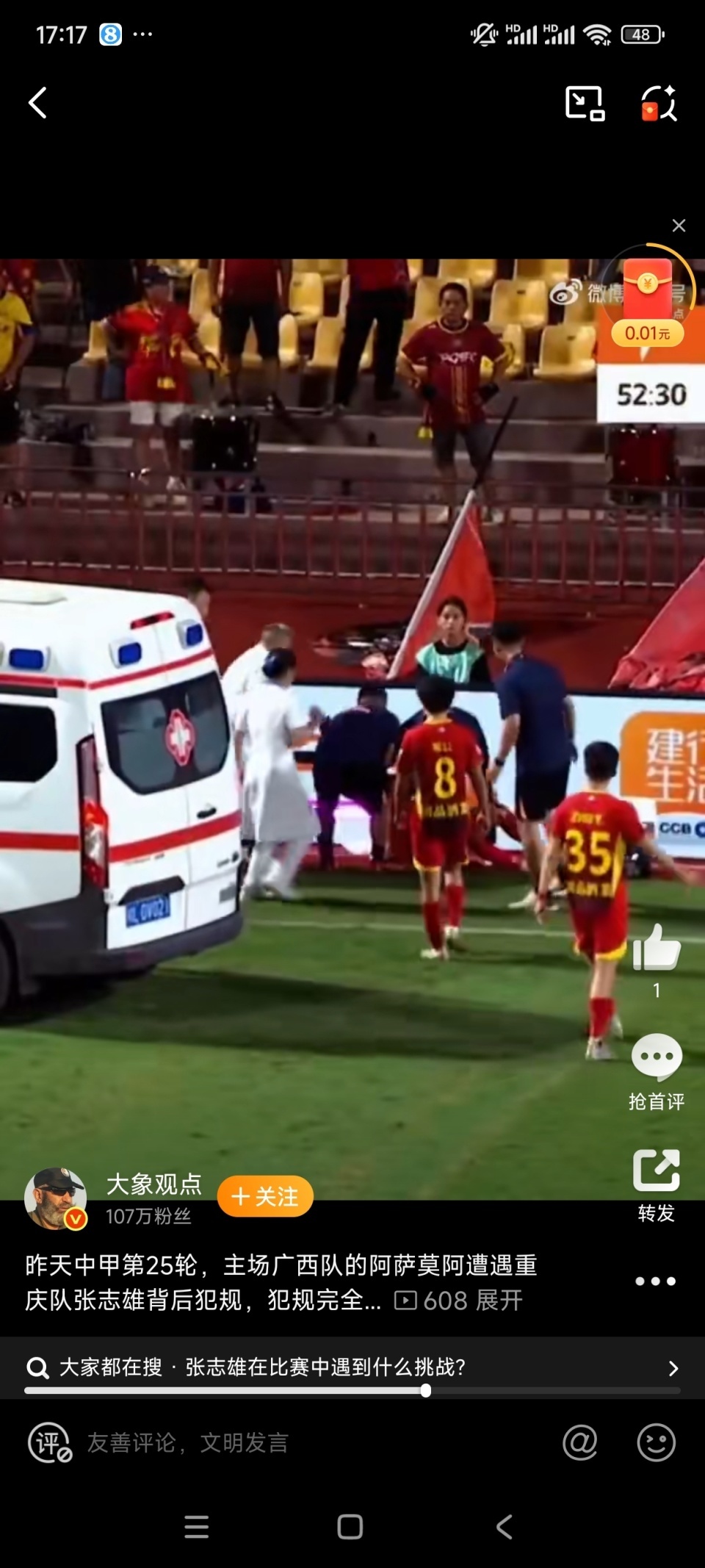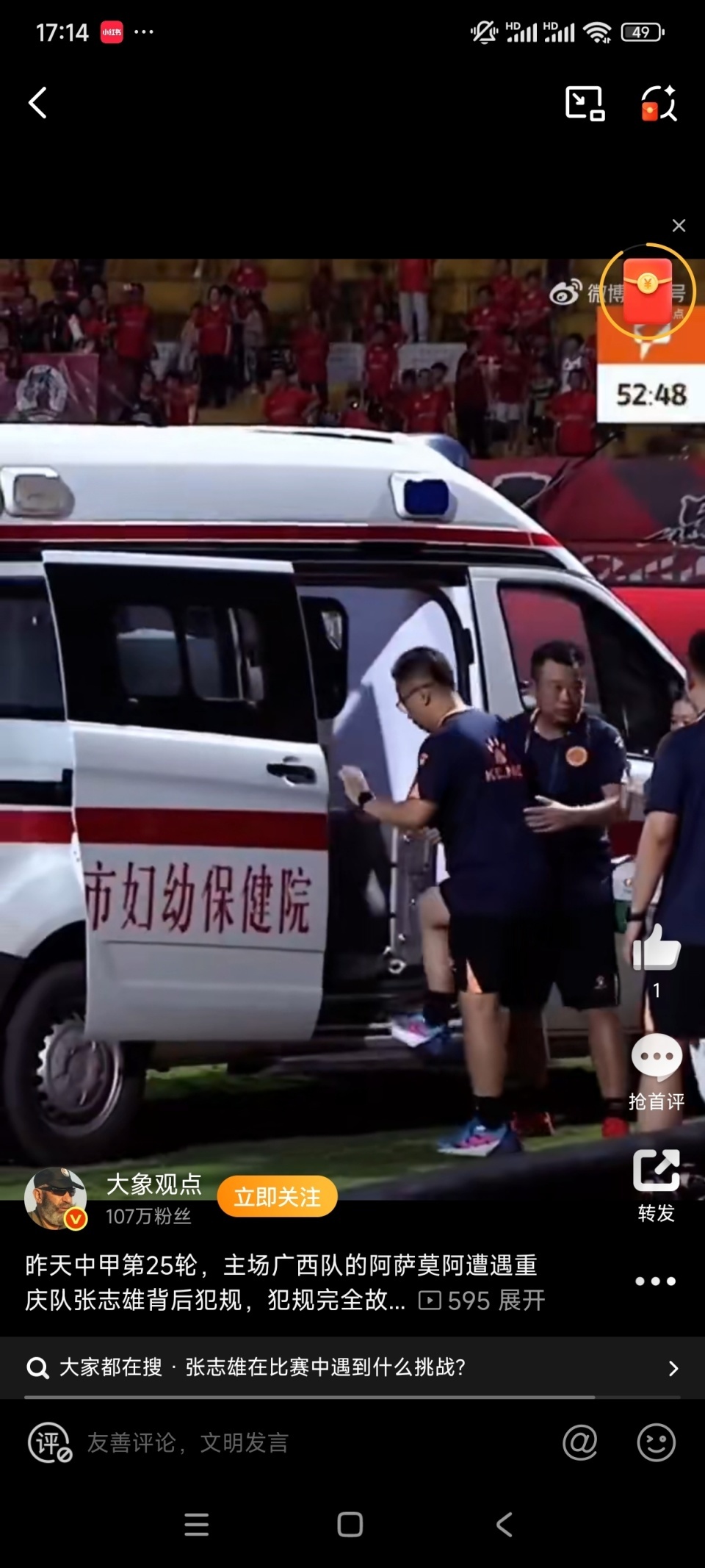 中甲第25轮,广西平果对阵重庆铜梁龙,第50分钟,张志雄在边线附近对阿萨莫阿犯规,后者与场外LED广告展示设备接触后倒地,后被救护车送往医院。裁判员判张志雄犯规并出示黄牌警告,VAR未介入。