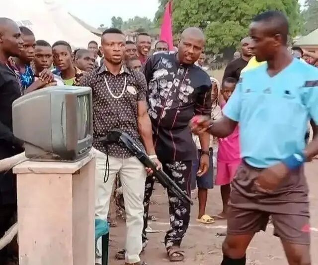 好歹亚洲足球赛场的场边,一般是不会见到持枪威胁裁判的场面的!