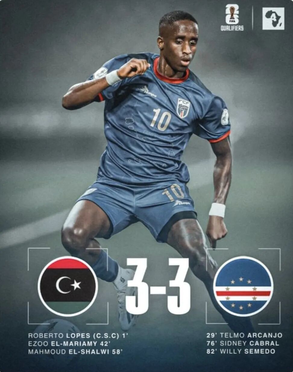 面对世界排名第114的利比亚队,客场作战的佛得角队在1-3落后的情况下连追两球,第82分钟将比分扳为3-3。