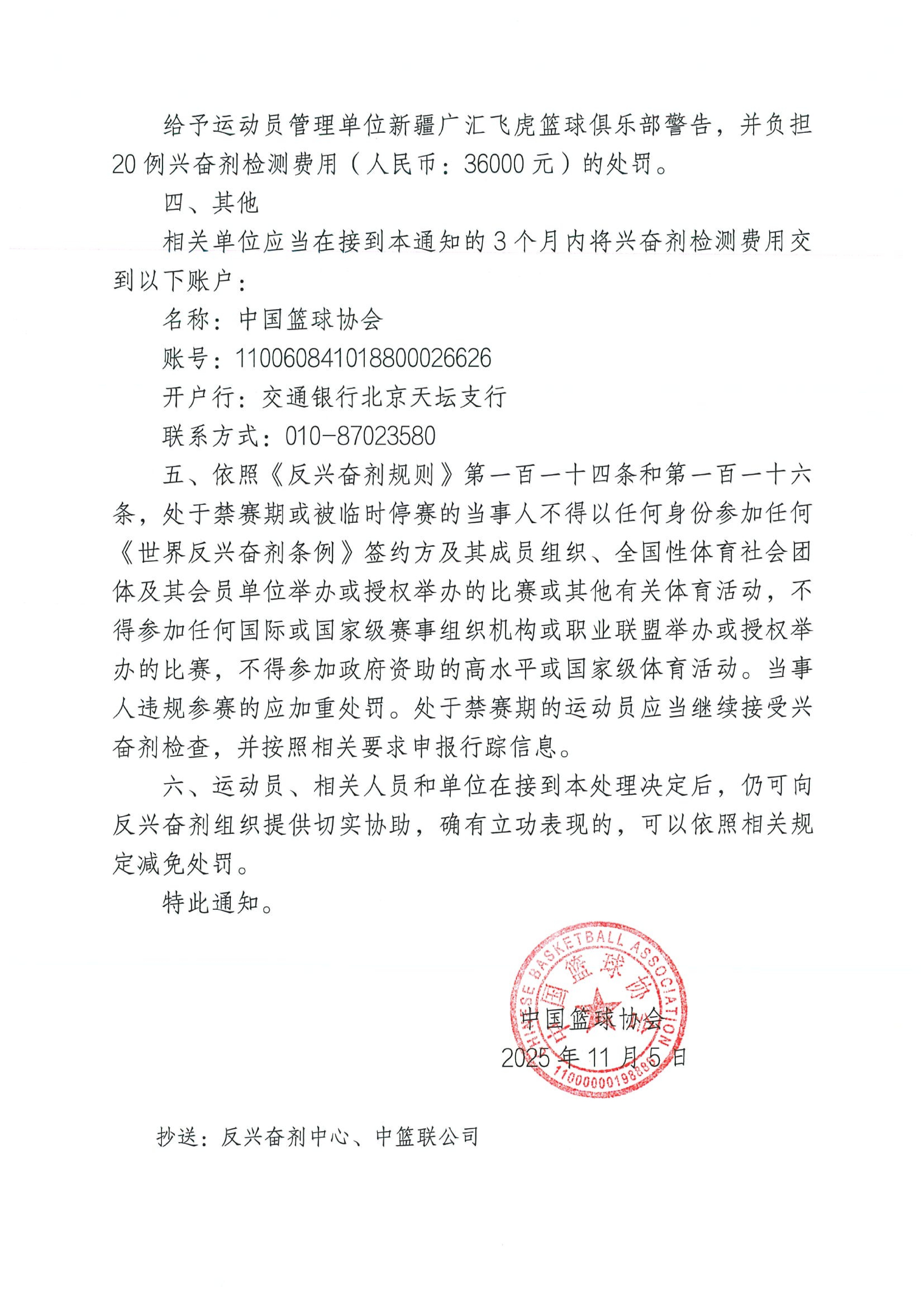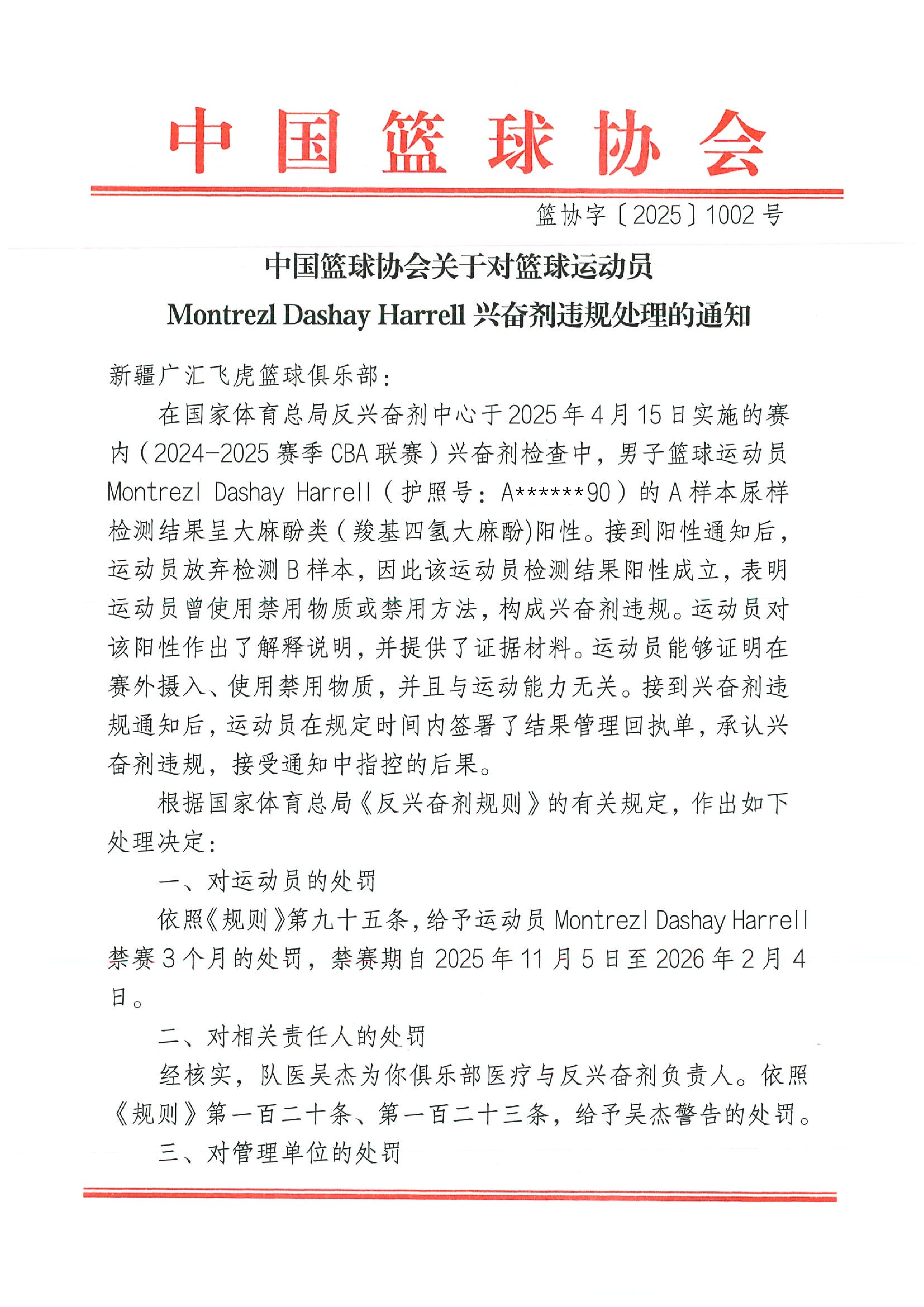 北京时间今日,中国篮协官方发布公告,上赛季效力于新疆男篮的外援蒙特雷兹-哈雷尔因兴奋剂违规被禁赛三个月,新疆男篮则承担20例兴奋剂检测的费用共36000万元。