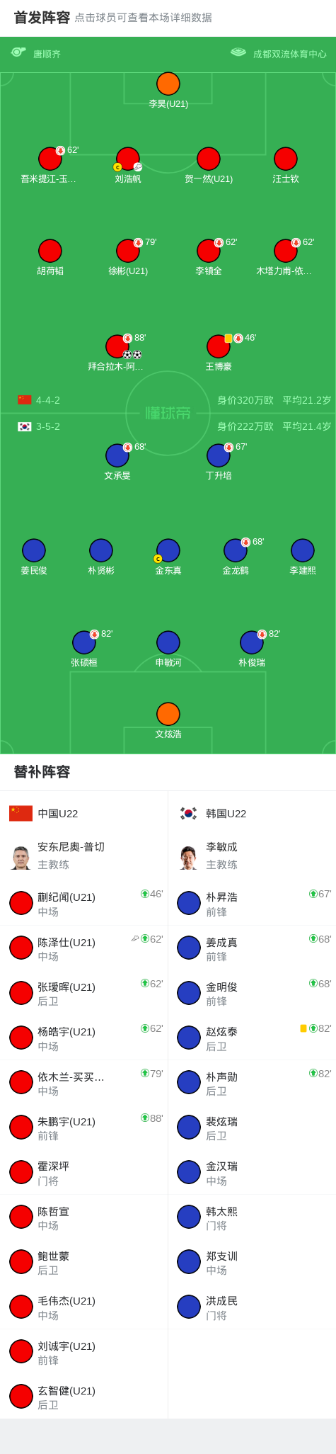 北京时间11月15日中国之队熊猫杯国际足球邀请赛 成都邀请赛 第2轮,中国U22对阵韩国U22。中国U22拜合拉木-阿卜杜外力梅开二度。最终比分中国U22 2-0 韩国U22。