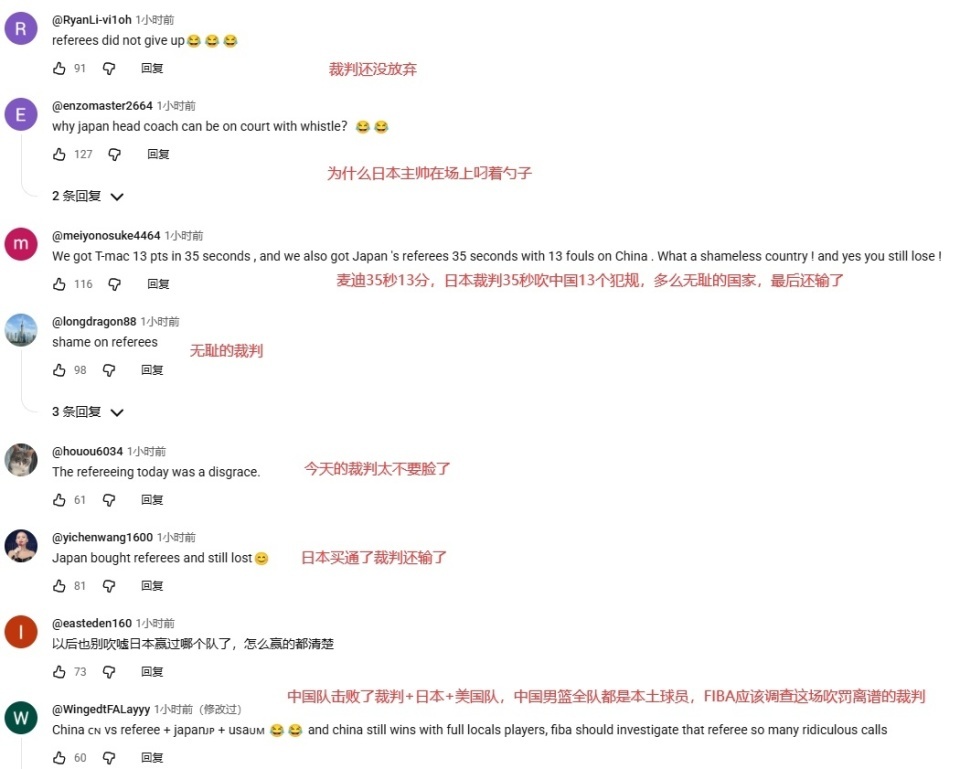 “为什么日本主帅在场上叼着勺子”,“麦迪35秒13分,日本裁判35秒吹中国13个犯规,多么无耻的国家,最后还输了”,“今天的裁判太不要脸了”,“日本买通了裁判还输了”,“中国队击败了裁判+日本+美国队,中国男篮全队都是本土球员,FIBA应该调查这场吹罚离谱的裁判”。