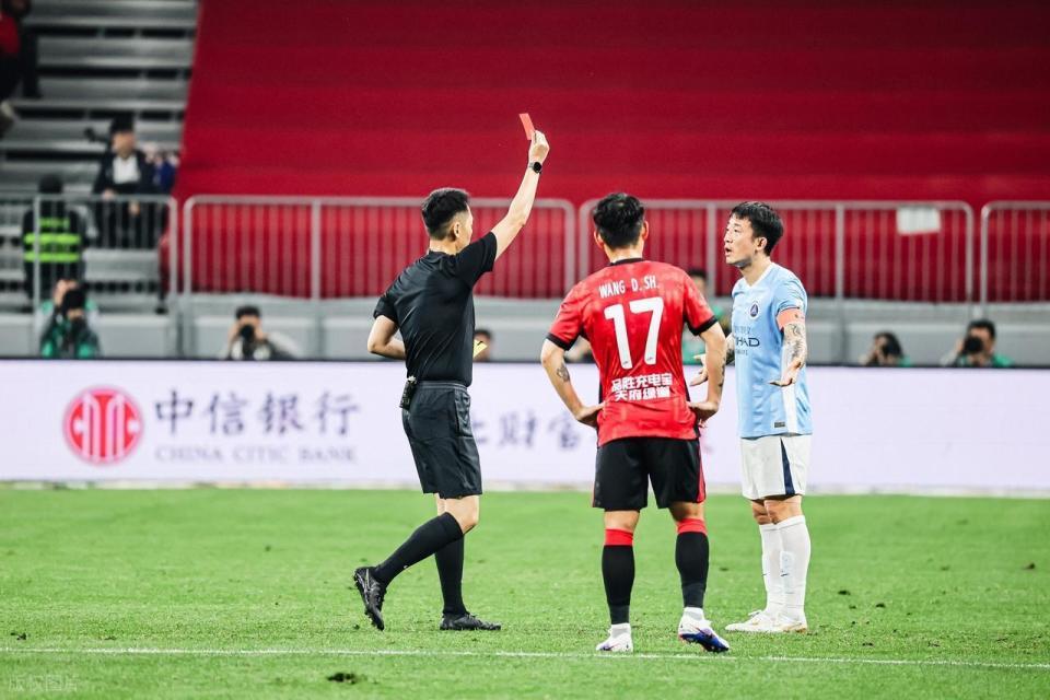 本场揭幕战第16分钟,姜至鹏在防守韦林顿时,双方发生身体对抗,姜至鹏的肘部不慎击中韦林顿面部,导致后者嘴唇受伤流血,场面较为惨烈。主裁判王迪第一时间到场查看,初步判断动作幅度不大,出示黄牌予以警告。但VAR随即介入,反复回放姜至鹏的肘部动作,王迪在观看回放后,果断改判直红,将姜至鹏罚出场外。这一改判,直接打破了场上均势,多打一人的成都蓉城随后连扳两球反超比分,而深圳新鹏城则因少一人作战,彻底陷入被动。