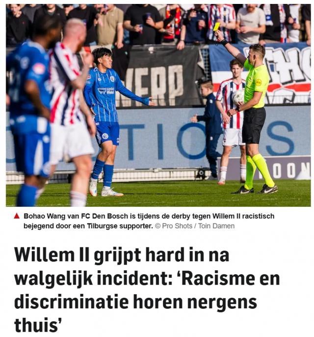 直播吧03月09日讯 昨晚荷乙第30轮,邓伯什客场1-1战平威廉二世。比赛第84分钟,当值主裁判向中国留洋小将王博豪出示黄牌后不久,看台上有人做出“拉眼角”这一带有种族主义色彩的冒犯性手势。威廉二世俱乐部今日发布公告对此事进行回应。