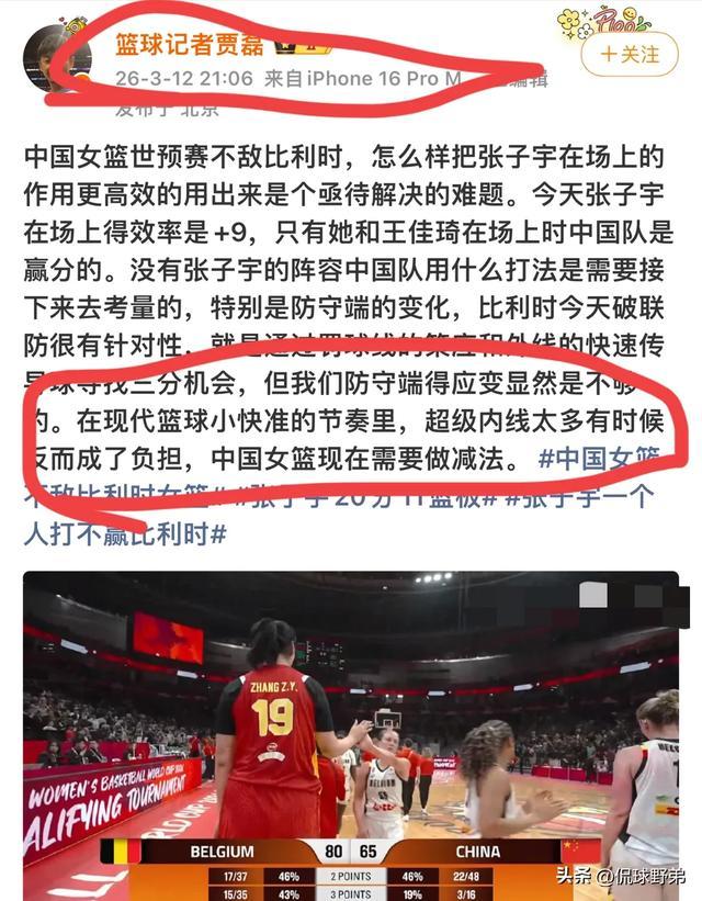 中国女篮世预赛不敌比利时,怎么样把张子宇在场上的作用更高效的用出来,是急需解决的难题。今天张子宇在场上得分效率是+9,只有她和王佳琦在场上是中国女篮是赢分的,没有张子宇的阵容,中国女篮用什么打法,是需要接下来去考量的,特别是防守端的变化。比利时今天破联防很有针对性,就是通过罚球线的策应和外线的快速传导球寻找3分机会,但是我们防守端显得应变不够。在现代篮球小快准的节奏里,超级内线太多时候反而成了负担,中国女篮现在就是需要做减法。