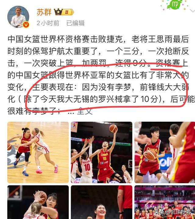 中国女篮世界杯资格赛击败捷克,老将王思雨最后时刻的保驾护航太重要了,一个3分,一次抢断反击,一次突破上篮加两罚,连得9分。资格赛上中国女篮跟世界杯亚军的女篮有了很大的变化,主要表现是因为没有李梦,前锋大大的弱化,以后国家队很难再有李梦了,中锋的战术核心作用在弱化。一号位杨舒予迅速成熟,她和韩旭那一组的效率是最高的,也是最能够调动全队的人,但韩旭最后上的太晚了,张子宇还很年轻,没有经验,移动慢,跟现代篮球节奏比较脱节,因为世界杯距离较近,在世界大赛上成为决定性因素还远远不够。所以如何使用还讲究方法。