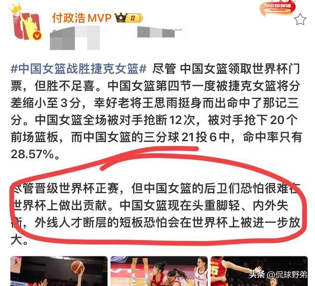 尽管中国女篮领到了世界杯门票,但是这场比赛依然是值得总结。中国女篮第四节一度被捷克女篮将分差缩小到3分,幸好老将王思雨挺身而出命中的那记三分,中国女篮全场被对手抢断12次,被对手抢下20个前场篮板。而中国女篮的三分球21投6中,命中率只有28.57%。尽管晋级了世界杯正赛,但中国女篮的后卫恐怕很难在世界杯上做贡献。中国女篮现在是头重脚轻,内外失衡,外线人才断层的短板恐怕会在世界杯上被进一步放大。