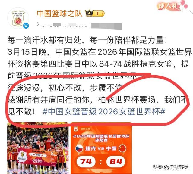 比赛结束之后,中国篮球支队第一时间发布了动态:“每一滴汗水都有归处,每一份陪伴都是力量。中国女篮2026年国际篮联女篮世界杯资格赛第四轮比赛以84:74战胜捷克女篮,提前晋级2026年国际篮联女篮世界杯。征途漫漫,初心不改。步履不停。感谢所有并肩同行的你,柏林世界杯赛场,我们不见不散。”